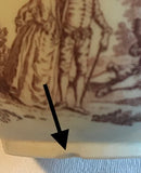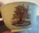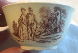 18th Century Worcester Porcelain Red Transfer Printed Teabowl. Transfer-printed in brick red with Robert Hancock's "La Cascade," pattern, illustrating a fashionable couple walking beside a mandolin player and a pair of amorous lovers, the obverse with a sculptural fountain, the interior with a slender band border.