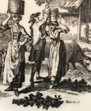 Delicate gilt band to rim, enclosing the black-transfer printed scene of a farmyard centering two Milkmaids, with a man loading up the bucket atop one maid's head. The scene set in a farmyard with two cows feeding, among hay and shrubbery, with a hayrick and two ladders, one under a tree, with broad foliage. The engraved scene by Robert Sayer.