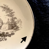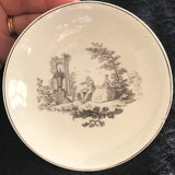 The teabowl on foot, with slender black bands to rim interior of teabowl and toward rim on saucer, enclosing a delicate print of Robert Hancock's Singing Lesson. The print after an illustration by Boitard. The teabowl verso with a print of a neoclassical ruin.