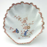SOLD Bow Porcelain large shell-shaped dish, the arcaded base support encrusted with white and pink glazed shells and algae, the face painted in Kakiemon style with "Two Quail" pattern within an iron-red and gilt flowerhead and foliate rim.
