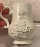 French 18th Century St Cloud Porcelain Blanc d Chine Cream Jug, of pear-moulded form, with integral spout, and C-scroll handle, the body moulded in high-relief with flowering prunus branches.