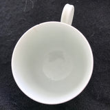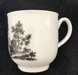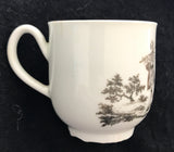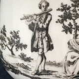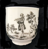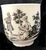 The coffee cup on foot with ridged handle and very slightly everted rim. Transfer-printed in black enamel with a rare variation of Robert Hancock's "The Singing Lesson" with the Music Teacher standing, playing the flute and the lady seated with an open score in her lap. The rustic ruins usually present to the left of the Teacher is absent in this variation. Three tree form a rhythmic element in between the figures. The more simplistic visual elements, the intense depth to the enamel and the crispness of the print combine to make this a great rarity.