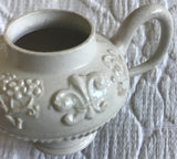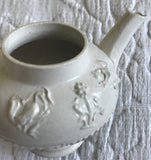 English 18th Century Salt-Glaze Stoneware Miniature Teapot and Cover of globular form, with faceted spout and fluted mid-lower body, over tapering plain body, with stepped foot. Rolled, arched handle, with curled terminate. Applied sprigs to the shoulder, upper body, of squirrel, fox, fleur-de-lys, flowers, etc.