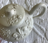 Condition: tiny chip to spout, tip; one sprig lacking curled terminate; a series of shallow chips to the rim of the cover; and two chips to knop.