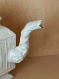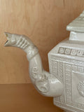 Diamond-shaped body, each paneled side slip-cast with a central shell in a recessed square, a key-pattern band to edges, on a stepped pedestal foot, the spout moulded with a human face and arm entwined by a gaping serpent, the rolled handled with flattened notches.