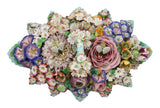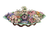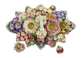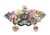 SOLD Continental Porcelain Flower-Encrusted Inkwell, 19th Century, the body of pointed foliate form, issuing a handle to center, the entire surface encrusted with carnations, roses, morning glories, and other flowers. The inkwells of cylindrical form, each topped by the figure of a bee. The base painted with a medium green ground, with undulating twig-form foot. All painted in bright enamel hues.