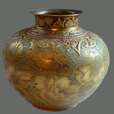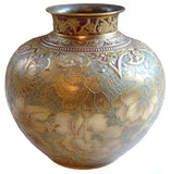English Royal Crown Derby Porcelain Globular Vase on foot with everted mouth over squat neck, the surface covered with chrysanthemums and other foliage painted with tri-tone gold enamels over the deep red-brown ground color.