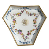 French Paris Nast Porcelain Shaped Tray, circa 1820, the tray of irregular hexagonal form to the front, the exterior walls painted with a band of blue bows and flowers, the interior side walls and tray face painted with blue ribbons and bows and floral garlands, all under gilt bands to edges, centering a gilt stylized foliate circle. Iron-red printed NAST A PARIS marks to underside.