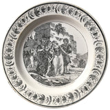 SOLD French Creil Creamware Plate, Transfer-Printed with a Scene of Turks Freeing Greek Women and Children in black, the scene in French reading "Les Turc Envenant Les Femmes et Les Enfans Grecs" within a laurel leaf and scrolling foliate border on the shoulder.