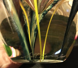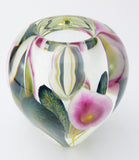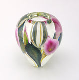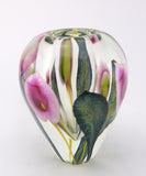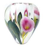 SOLD American Studio Art Glass Vase by Scott Bayless for Lotton Studios, the tapering cased glass vase with pink calla lilies and green yellow leaves.