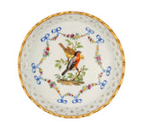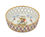 Dresden Meissen Marcolini Style Porcelain Basket-and Flower Molded Wine Coaster, with gilt-enamelled exterior, the interior painted with two birds on branches, within a swagged garland with blue ribbons.