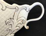 The silver-shaped vessel with arched handle, moulded in relief with scrollwork reserves on embossed latticework ground, with panels of cell-and-diaper pattern, all in the manner of salt-glazed stoneware. The banded rims and walls “pencilled” in black enamel; painted with a Chinoiserie landscape and floral sprays to the interior well.