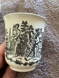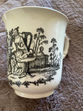 The cup with Rococo foliate c-scroll handle, under flared rim, on foot. The front transfer-printed in black enamel with Harlequin & Columbine seated at a tea table, flanked by sphinx and grotto columns, foliage and trees. Sprigged grasses to front.