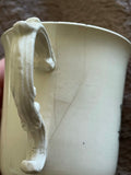 Condition: 2 3/8” and 2” long tight triangular cracks, right of handle, plus 1/4” lateral crack. Stress cracks to handle, near terminate. Chip to foot, two nicks.