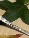 A nice long handle with the classic Old English pattern with a bright-cut crest to the top of the handle. The round bowl is pierced with a large center floral design, almost reminiscent of a snowflake. Marks to handle.
