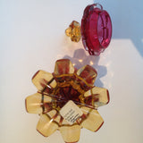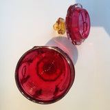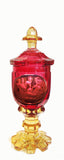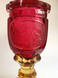 Fine and unusual German-Czech Bohemian tricolor amber, ruby and clear glass covered goblet or chalice on foot, acid-etched with three Hungarian viszlas or hunting hounds, foliate side panels, and raised oval medallion, with splayed petal-form foot. Unmarked. Circa 1840-1870. 13” H. (Very minor speck in cover knop, one light scratch to center panel.)