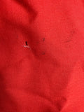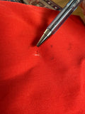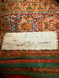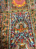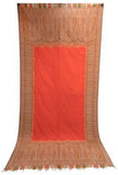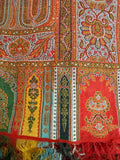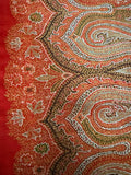 Jacquard Woven Wool Paisley Shawl, Scotland, circa 1860, worked with bright red field, the borders woven with long boteh and scattered floral motifs in turquoise, blue, green, mauve, yellow. Victorian, third quarter 19th Century. 51" x 10' 8". Condition: Bright colors, in fine condition, but for one 1/8" hole to red field. Small repairs to border. Tiny marks near hole.