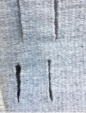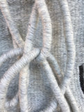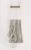 Contemporary Weaving and Tapestry by Aga Patacz of Canada, the rectangular woven body pendant from a wooden rod, the warp threads visible above the main section of the weaving. The main section of the composition is made up of grey woven wool, worked in a flaring rectangular shape, with a pendant free-hanging tube woven in loose entwined knots to the left, and a double slash cut into the flat surface to the right.