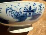 English Pearlware Underglaze Blue Painted Punch Bowl, \painted in the House pattern, the exterior of the bowl with Chinoiserie scene of pagoda or house, fringed trees, zig zag bands, and copious dashes representing birds in the sky. Bowl interior with a border of diagonal bands and semi-circles, over stylized foliate and floral paintings with the dashes possibly representing flying insects. Unmarked. Circa 1800. Approximate dimensions: 3 5/8” H. X 8 5/8” Diameter; 4 1/2 diameter, the foot. Condition: 1” Y crack to underside, center. Some areas of heavy wear rim, including a three shallow 1/4” glaze losses and chips. The bowl interior with crazing to glazes, scarification due to stacking, shallow cut marks, and glaze flakes.